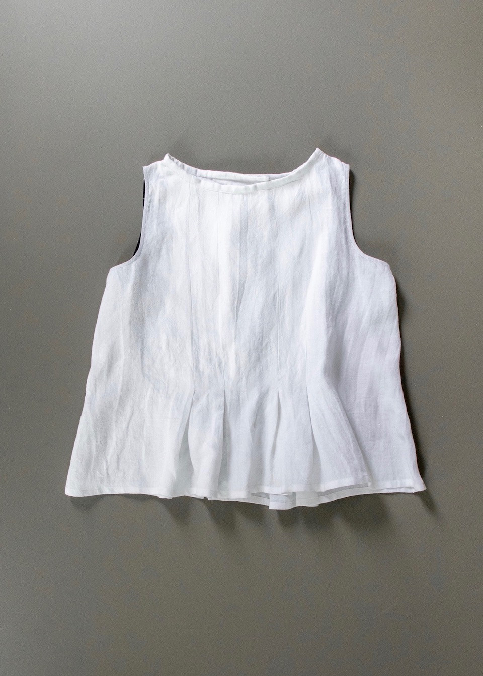Wide blouse, sleeveless, boat neckline, large pleats open from the waist, closure on the back with 2 small buttons.