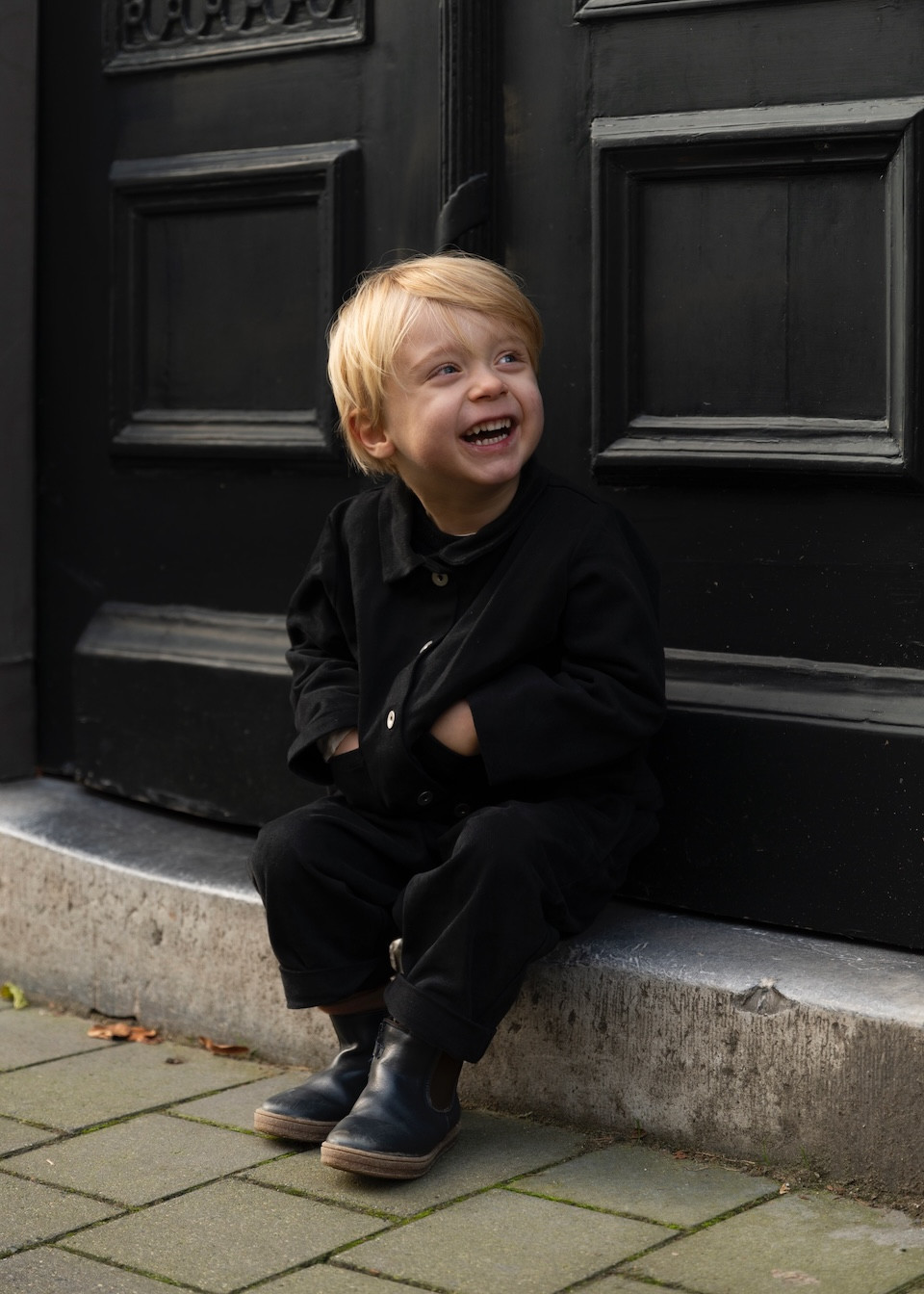 Wide and flared jacket for kids, without lining, with a small straight collar and two patch pockets on the front to hide small treasures for example.