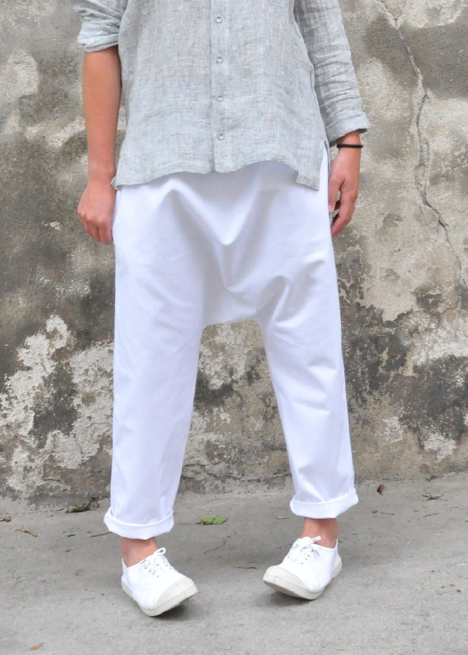 Pantalon sarouel, fourche basse, poches sur les côtés, taille élastique, longueur : cheville.