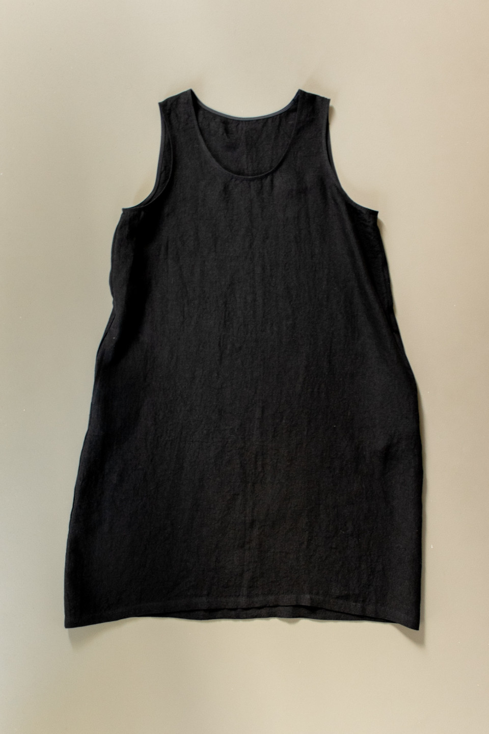 Robe évasée, sans manches, col profond, poches sur les côtés.